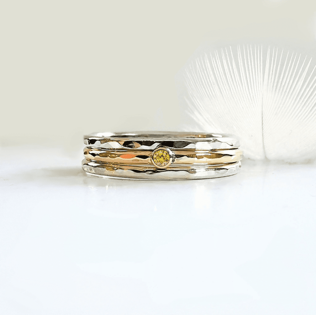 Solid 1.5mm 9ct gold textured ring with solid 9ct gold setting. Sat with two solid silver 1.5mm textured balancing rings. These stacking rings can be together or separately. Set with 2mm Heart In Diamond.