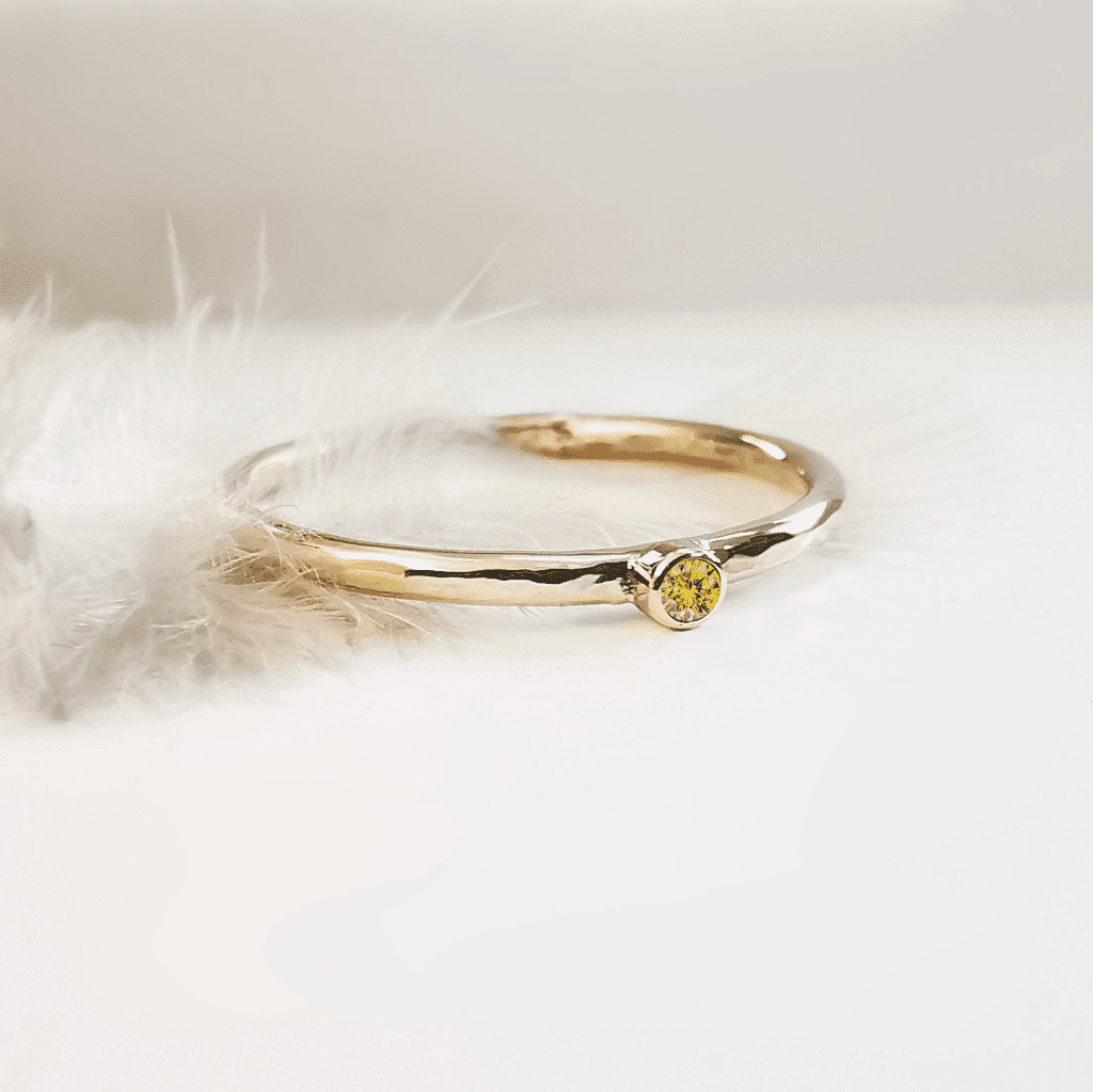 Solid 9ct gold 1.5mm textured ring with solid 9ct gold setting. Set with 2mm Heart In Diamond.