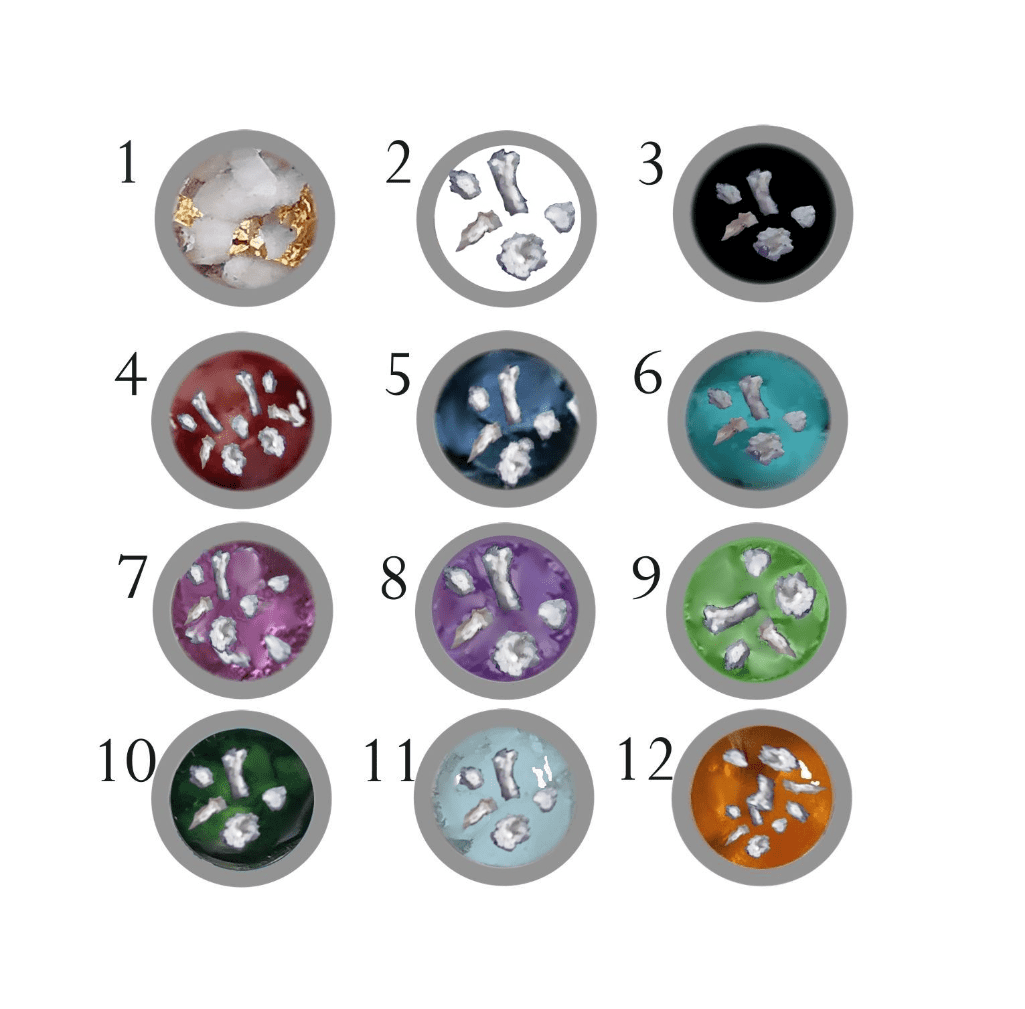 Memorial items include ash, hair or fragments of clothes that lost loved ones used to wear set in glass like resin. There are many coloured backgrounds to choose from.