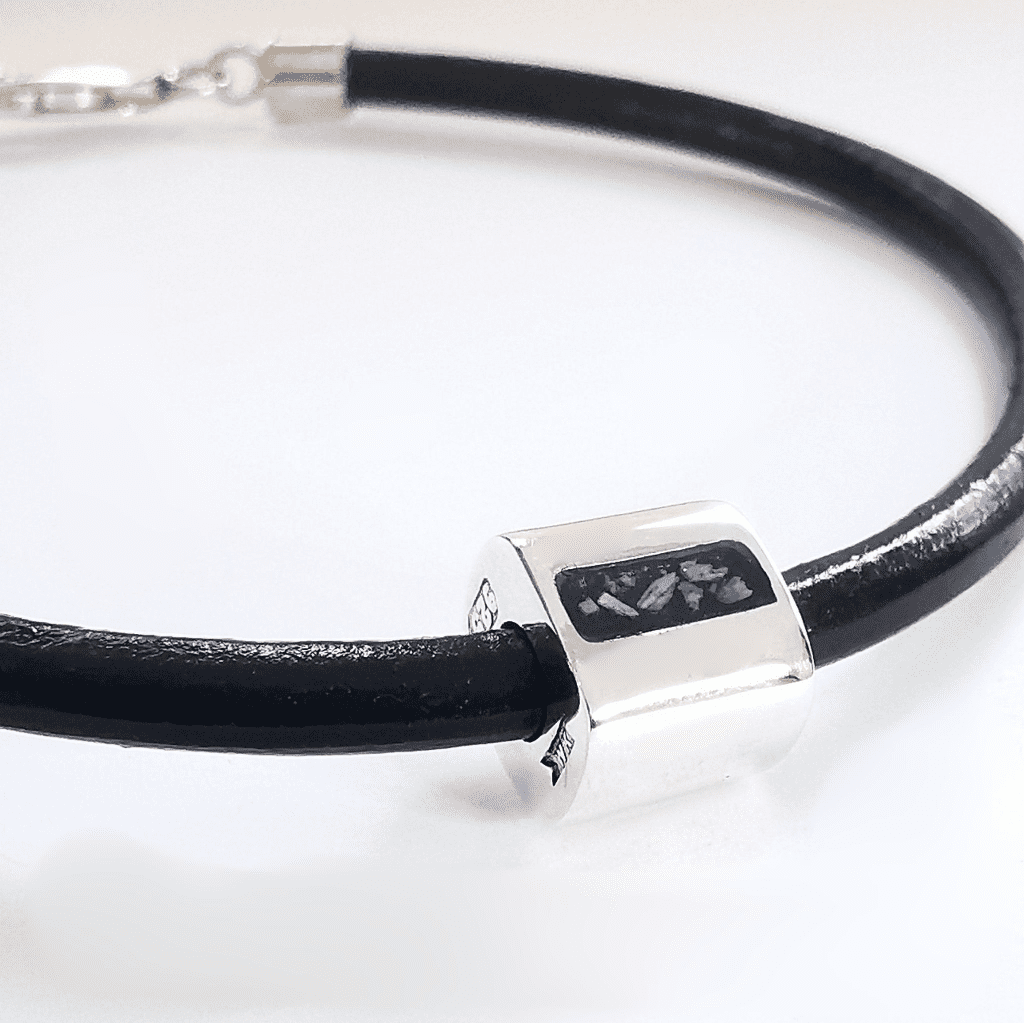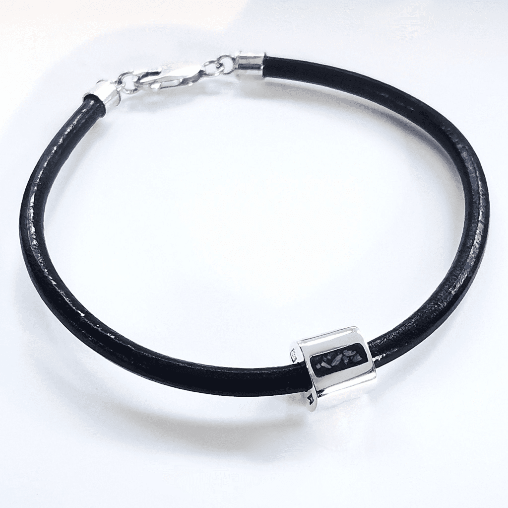 Chunky solid silver rectangular bead 9mm x 10mm x 9mm with inlaid memorial setting. Bracelet lengths are measured including the catch. 4mm black leather cord with solid silver fastenings.